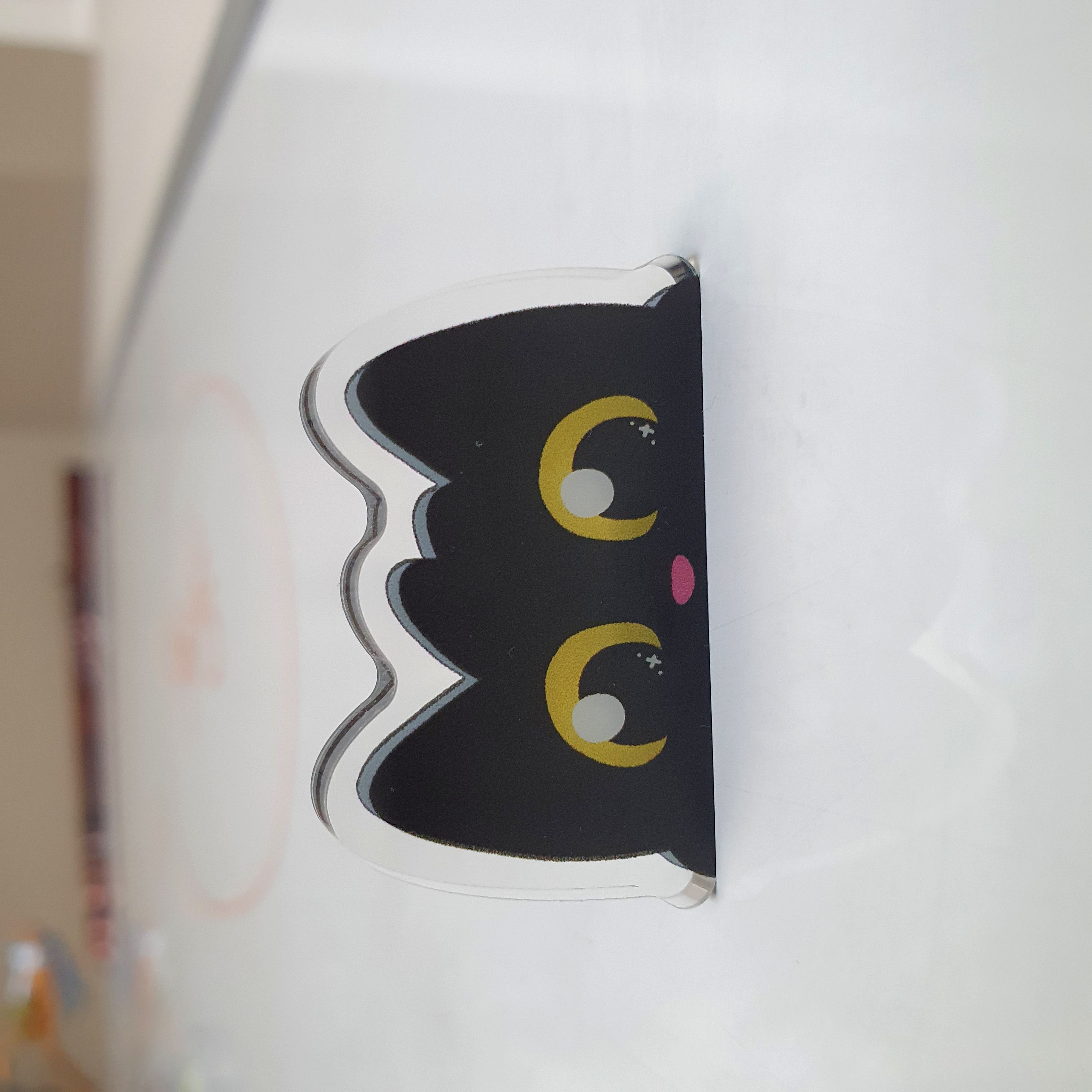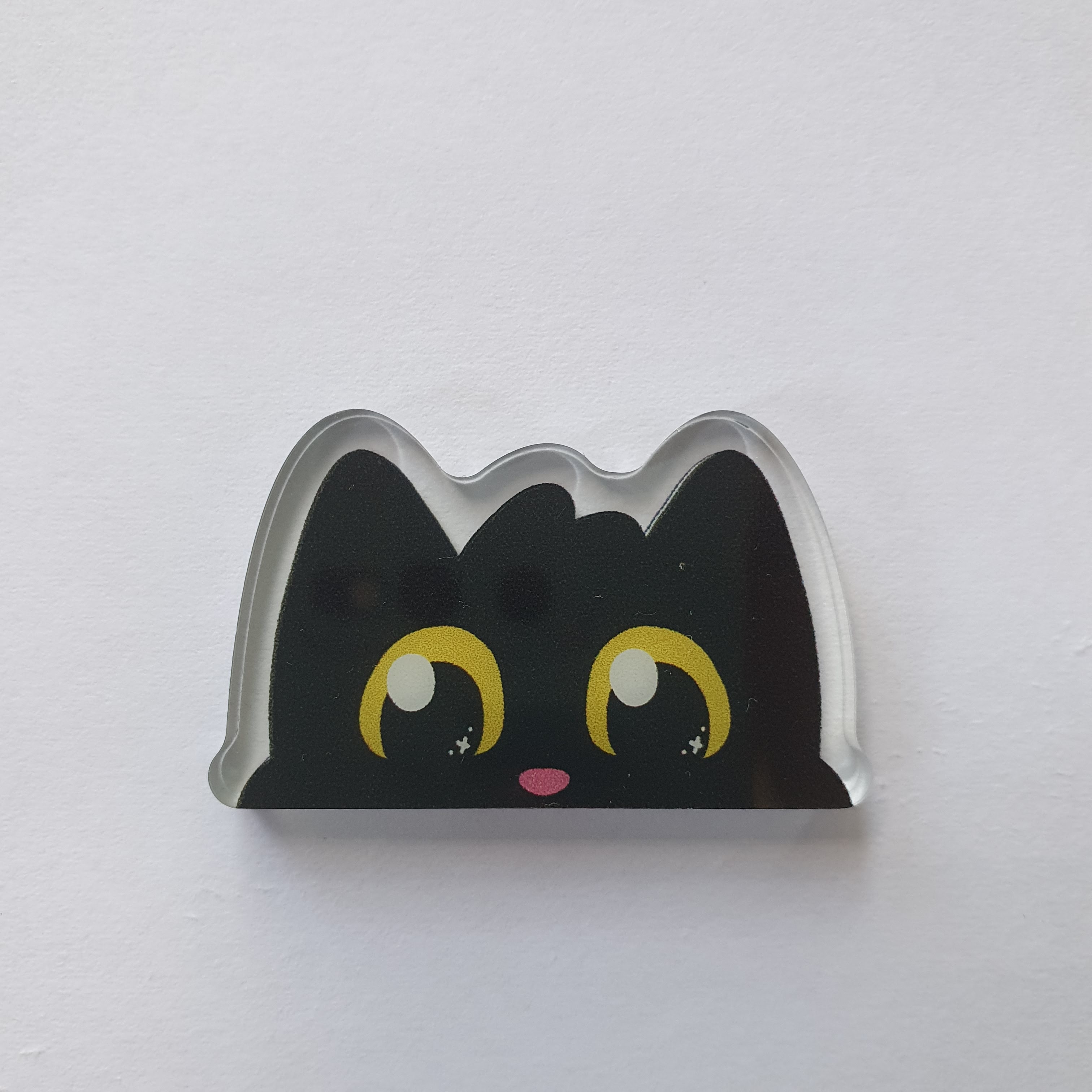 A cute black cat to watch you while you cook/eat/go about your day! This magnet is designed to be placed on the side of a fridge, sticking out. But it will also stick like a normal magnet flat against any magnetic metal surface, and can also be used to hold paper and such. Quite a strong magnet.