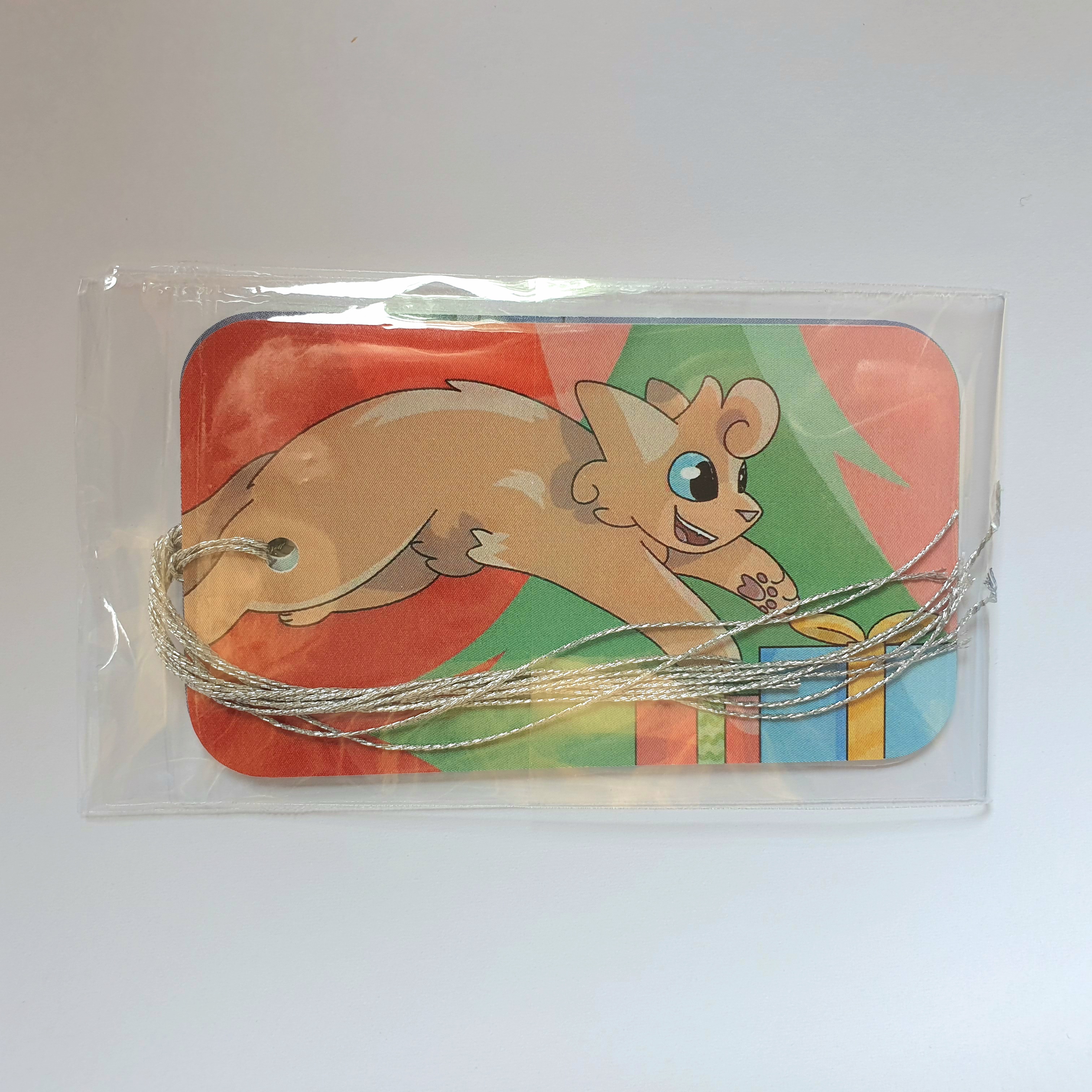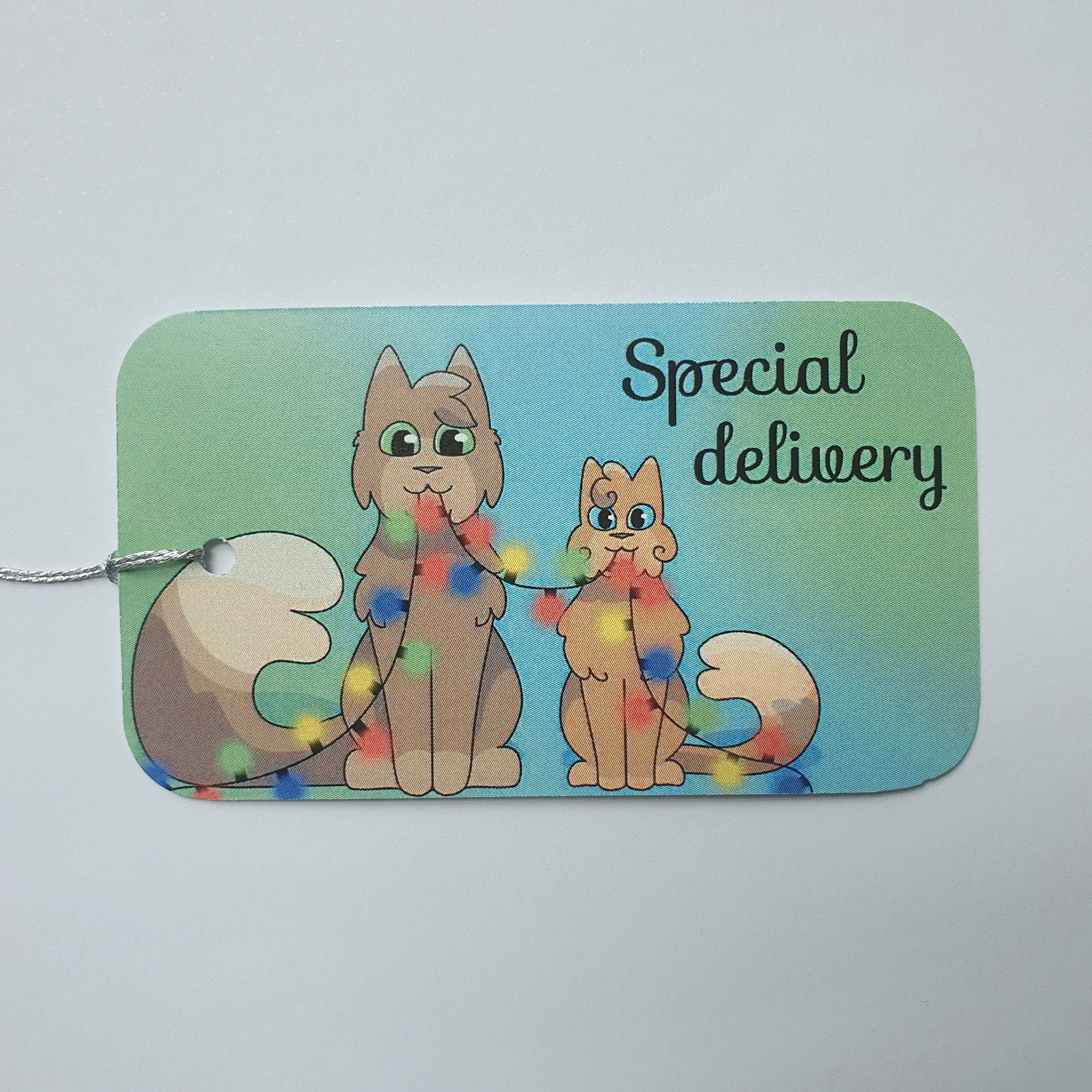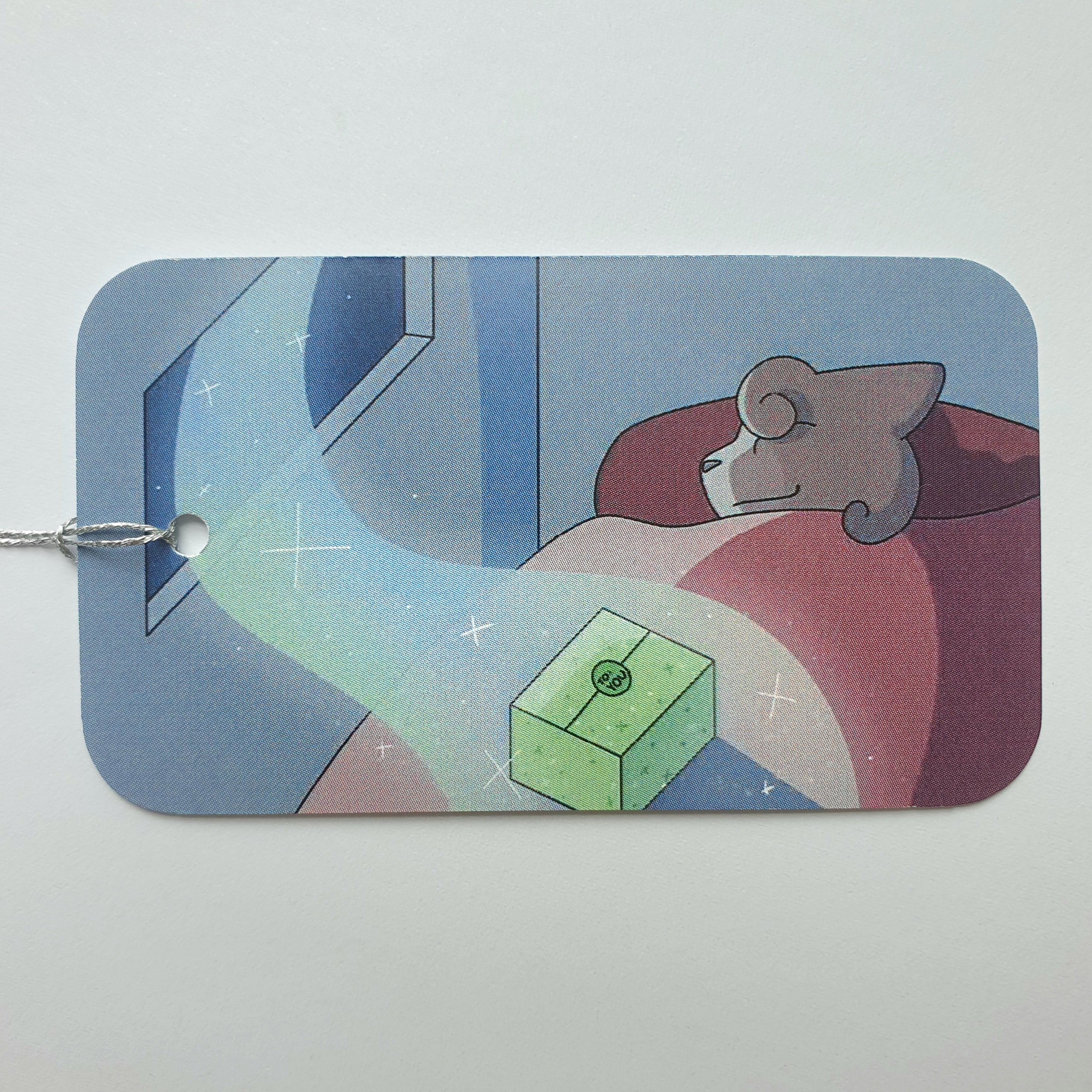 45mm x 79mm glossy card. Hand cut, rounded, and threaded.